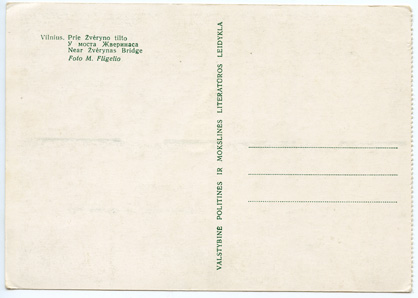 Vilnius. Prie Žvėryno tilto = У моста Жверинаса = Near Žvėrynas Bridge / foto M.Fligelio, [Vilnius] : Valstybinė politinės ir mokslinės literatūros leidykla, [1956], 1 atvirukas : spalvotas ; 10.4 x 14.8 cm.