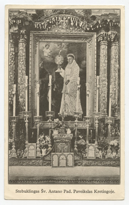 Stebuklingas Šv. Antano Pad. paveikslas Kretingoje, Klaipėda : Rytas, 1938, 1 atvirukas ; 14.5 x 9 cm.