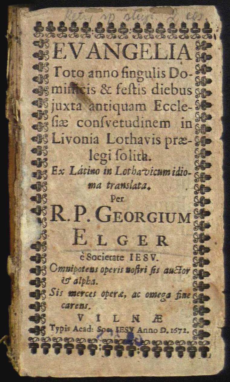 Įrišas konvoliuto [Elgers, Juris. Evangelia toto anno singulis dominicis et festis diebus juxta antiquam Ecclesiae consvetudinem [...]. Vilnae : typis Acad. Soc. Iesu, 1672.]