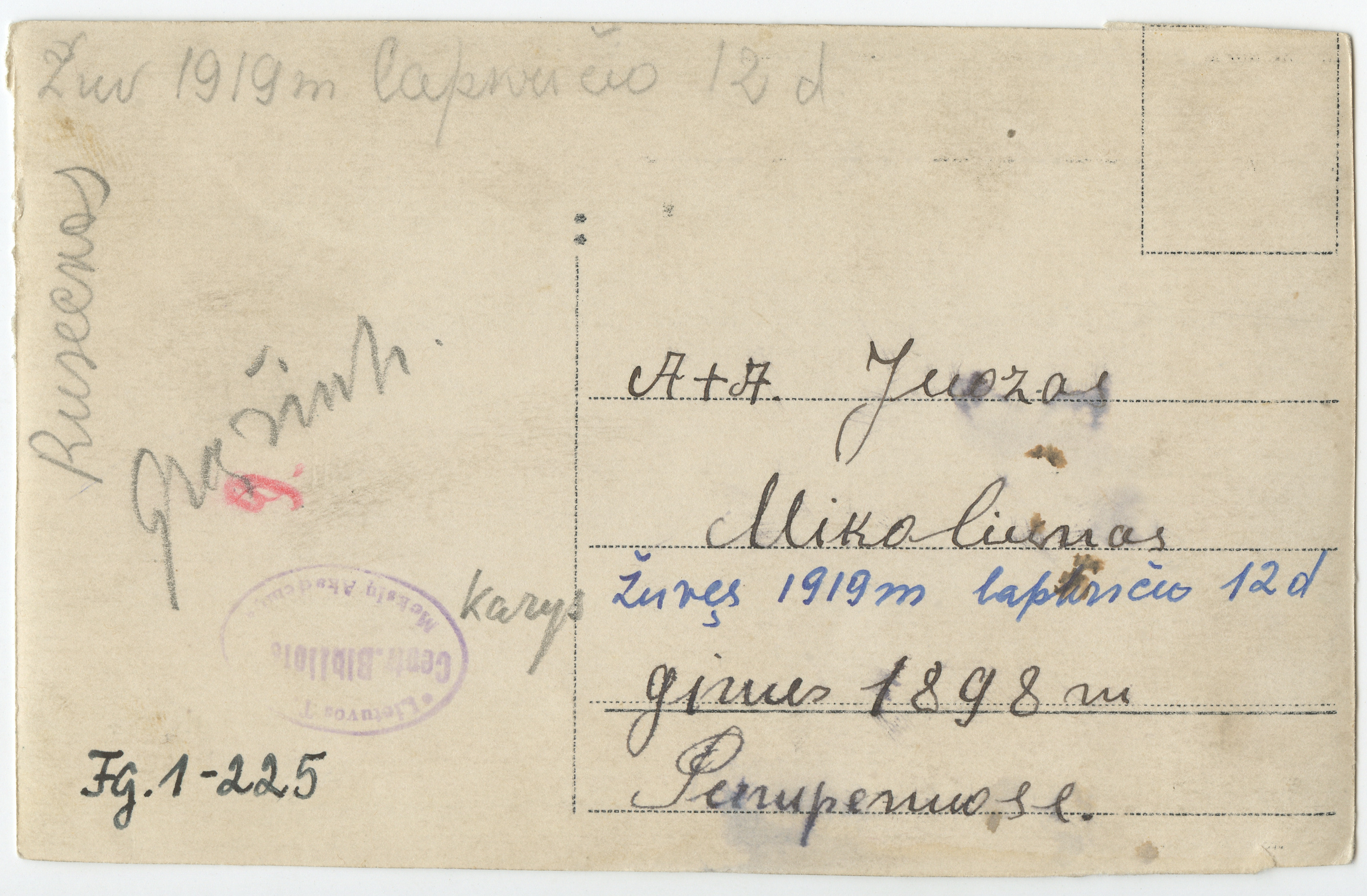 Lietuvos kariuomenės savanoris Juozas Mikoliūnas : [žuvęs 1919 m. lapkričio 12 d.], [Publikavimo vieta nenustatyta] : [leidėjas nenustatytas], [1918], 1 fotografija : nespalvota ; 12.8 x 8.2 cm.