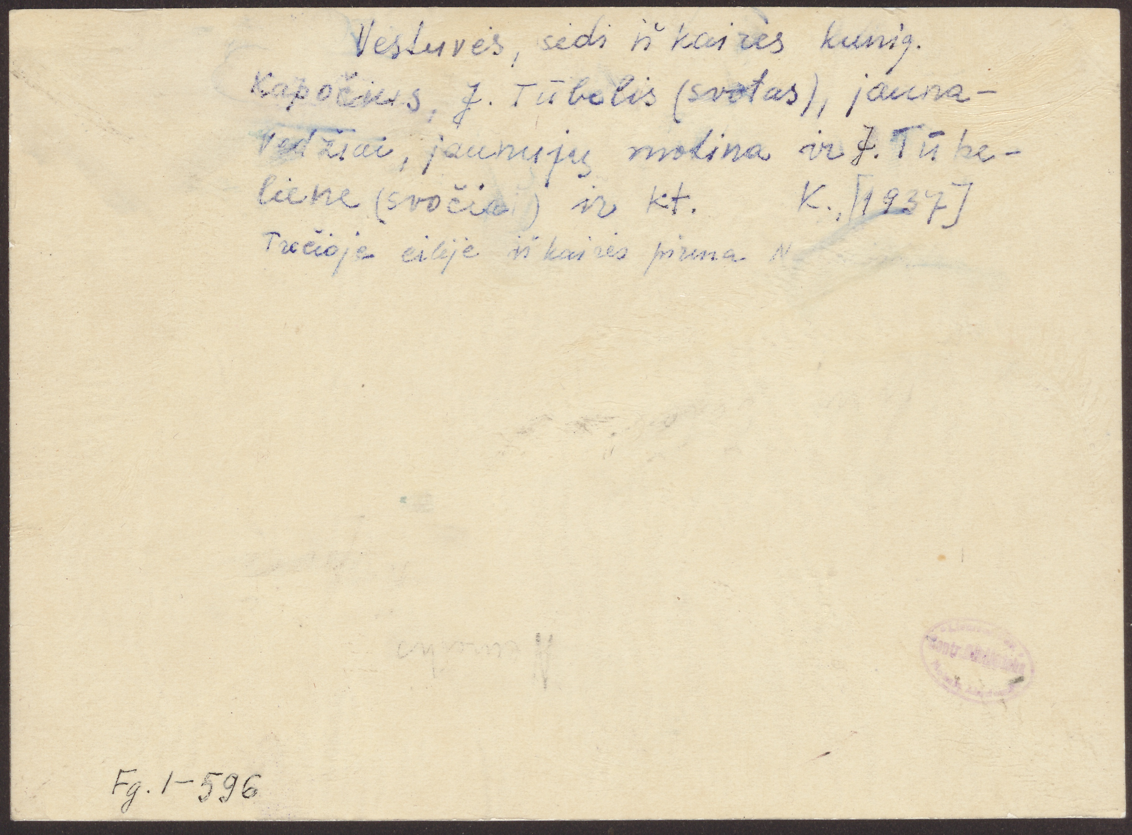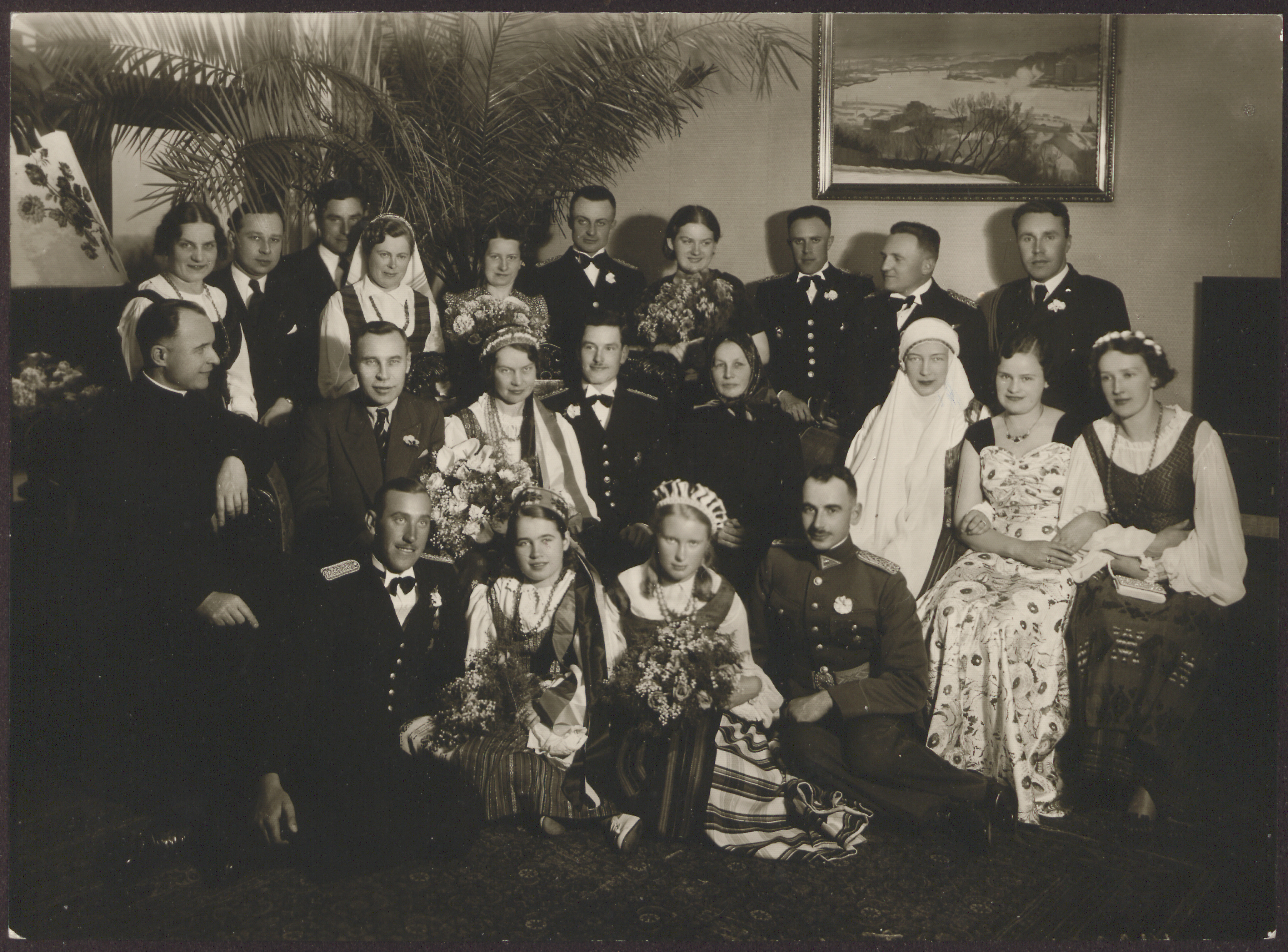 Grupė vestuvininkų su jaunavedžiais, [Kaunas] : [leidėjas nenustatytas], [1937], 1 fotografija : nespalvota ; 16.5 x 22.7 cm.