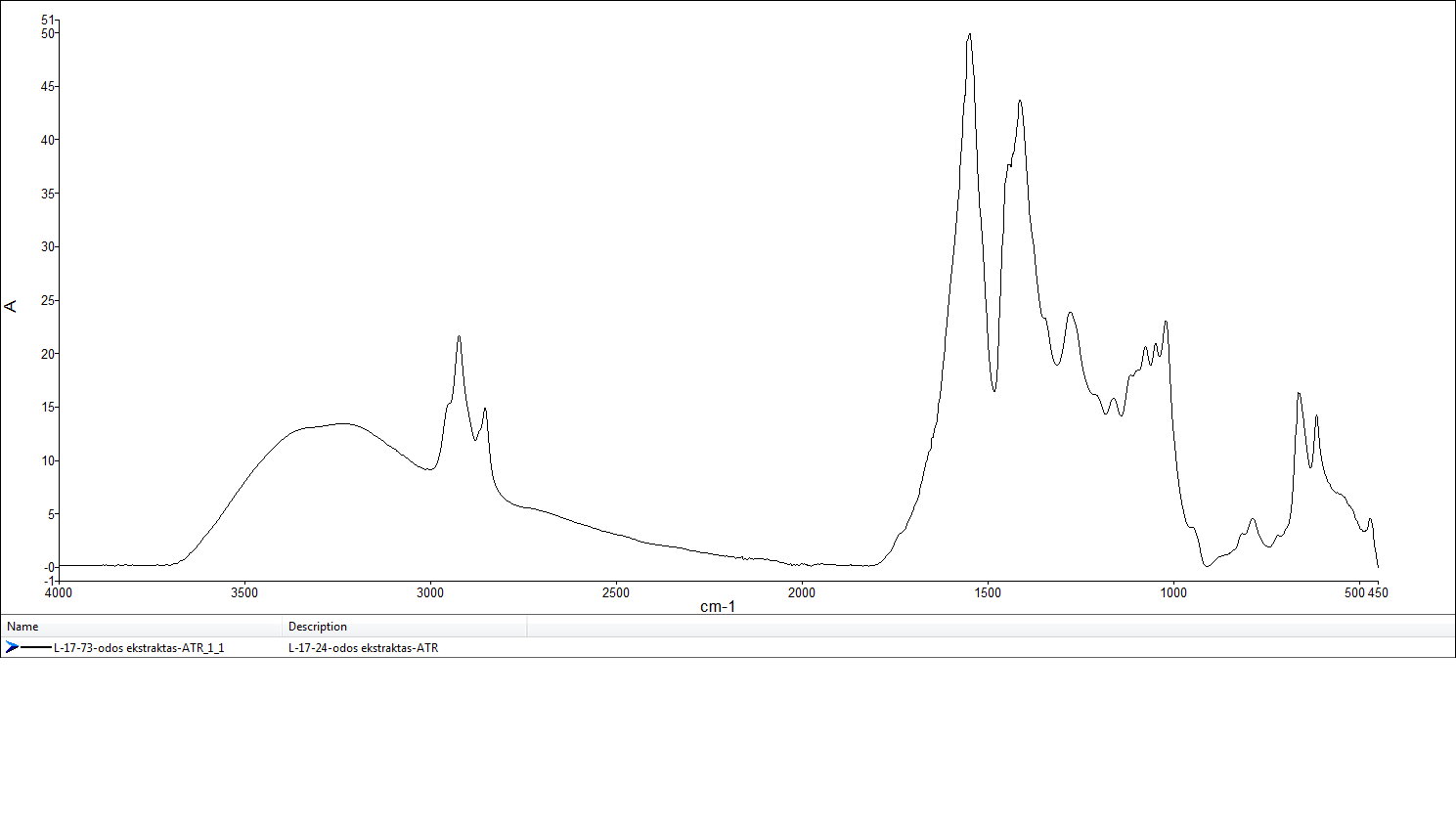 Mikrocheminiai ir instrumentiniai tyrimai: pH - 4,0; Geležies chlorido testas - teigiamas; Vanilino testas - teigiamas; Nitritinės rūgšties testas - neigiamas; Rodanino testas - neigiamas; Taninų klasė - Kondensuoti taninai; ATR-FTIR spektroskopija - Kondensuoti taninai.