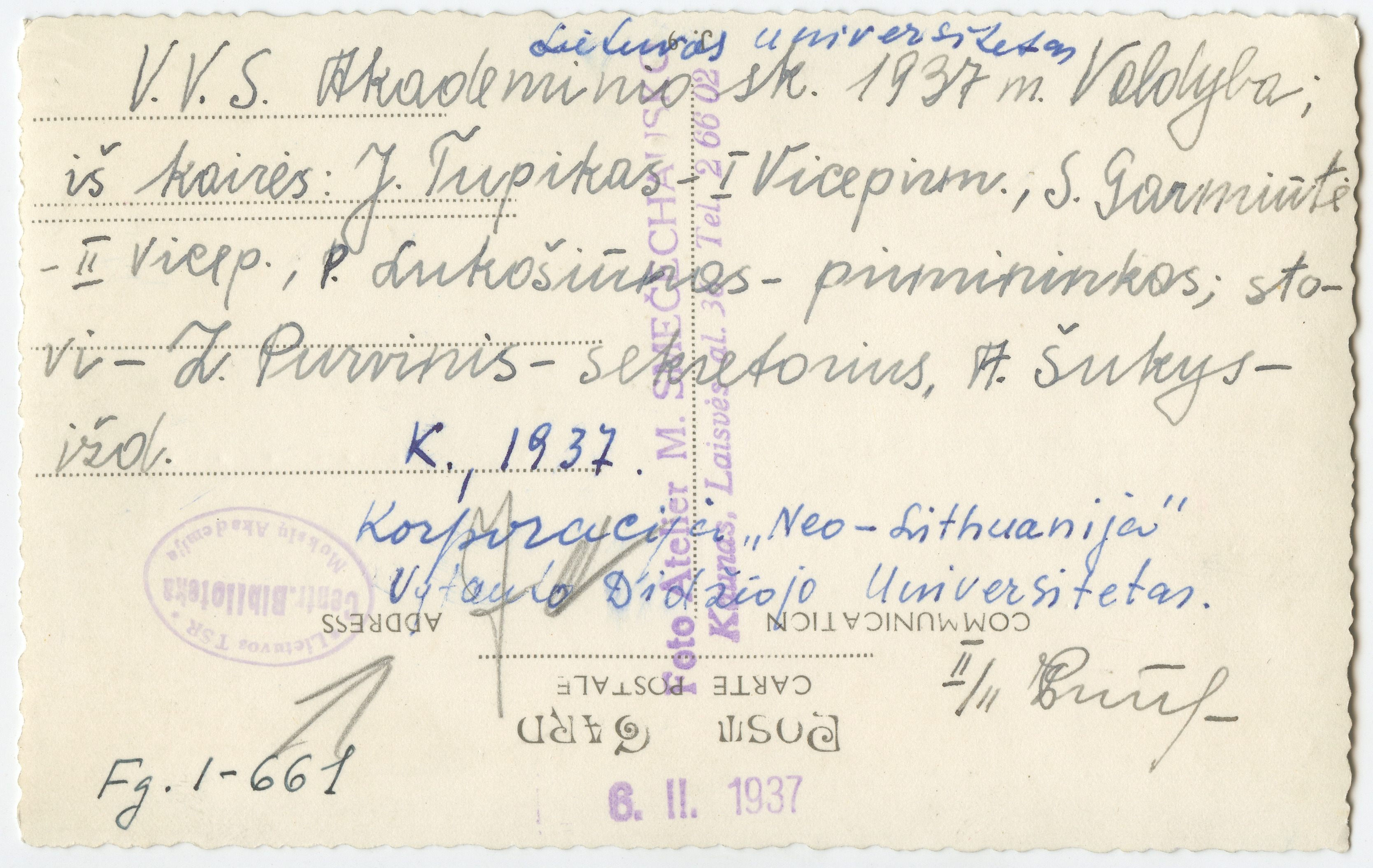 Vilniaus vadavimo sąjungos, Lietuvos universiteto Akademinio skyriaus valdyba / [foto M. Smečechauskas], [Kaunas] : [M. Smečechauskas], [1937], 1 fotografija : nespalvota ; 8.7 x 13.7 cm.