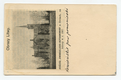Kościół Ewangielicko-Reformowany w Birżach, założony w r. 1867 : Kowieńskie pow. poniewieski, Wilno : E. Nowicki, 1906-1912, 1 fotokopija ; 7.5 x 7.6 cm ; 14.1 x 8.9 cm.