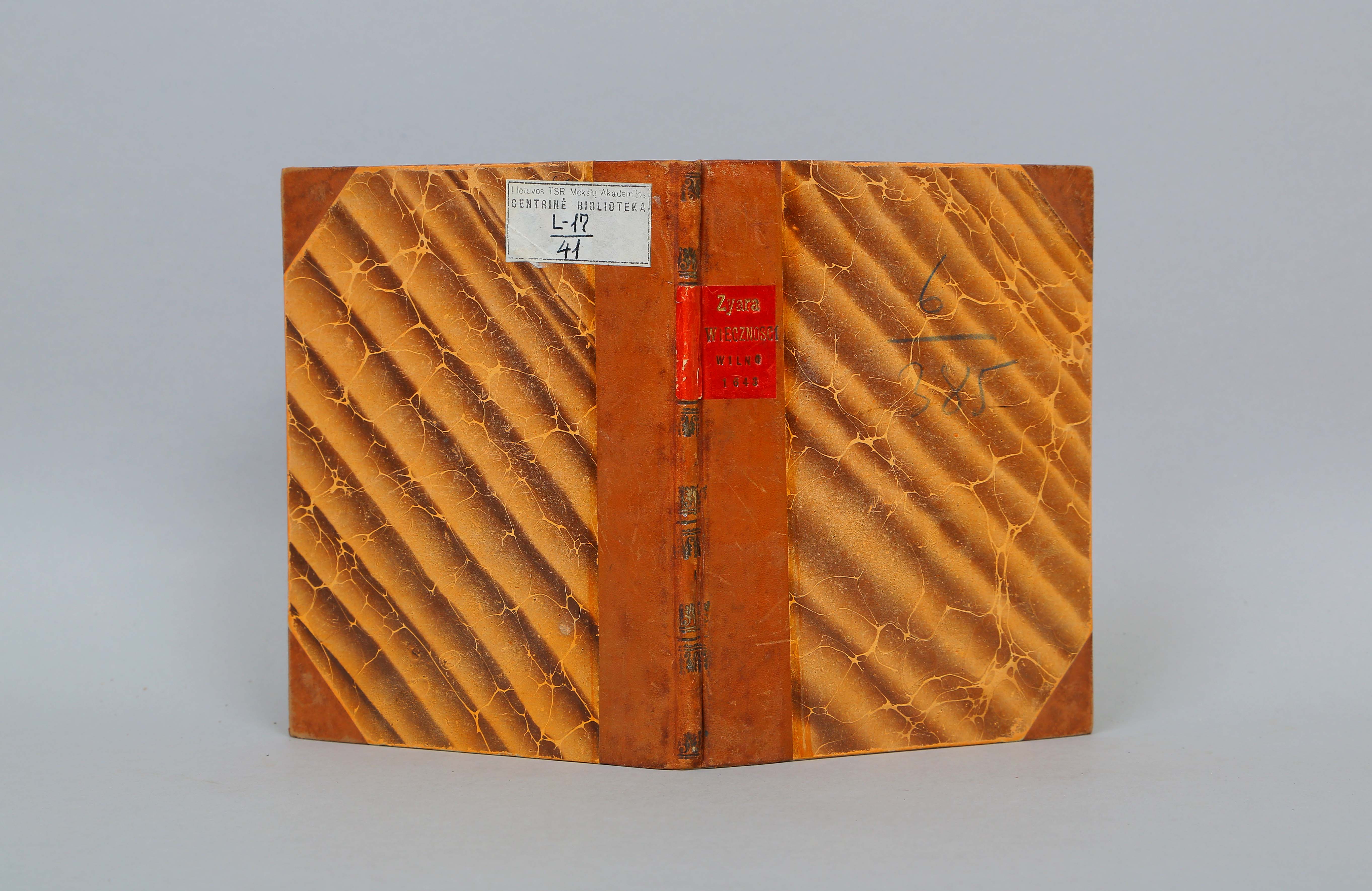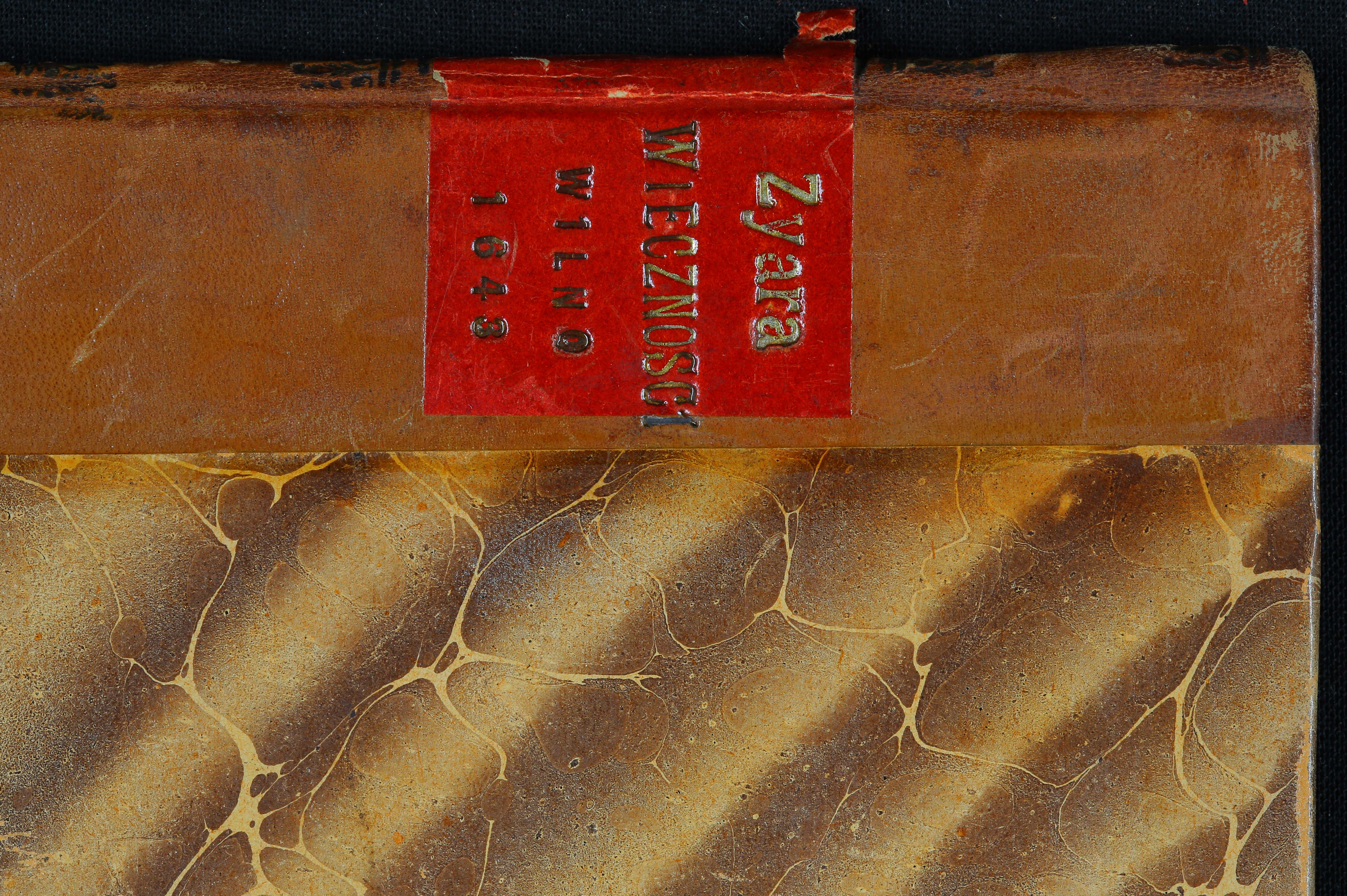 Įrišas knygos [Wituński, Augustyn. Tyara wiecznosti ... Katarzyny z Potoka Radziwiłowey xiężny na Birżach y Dubinkach [...]. Vilnae : typ. Acad. Soc. Iesu, 1643.]