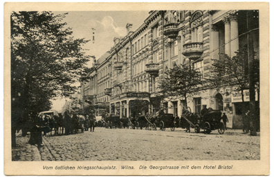 Vom östlichen Kriegsschauplatz : Wilna. Die Georgstrasse mit dem Hotel Bristol / Originalaufnahme vom Hofphotograph A.Kühlewindt, offizieller Kriegsphotograph, Königsberg i Pr. : Verlag Gebrüder Hochland, [1914-1918], 1 atvirukas ; 9.2 x 14 cm.
