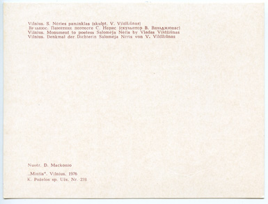 Vilnius. S.Nėries paminklas (skulpt. V.Vildžiūnas) = Вильнюс. Памятник поэтессе С.Нерис (скульптор В.Вильджюнас) = Vilnius. Monument to poetess Salomėja Nėris by Vladas Vildžiūnas = Vilnius. Denkmal der Dichterin Salomėja Nėris von V.Vildžiūnas / nuotr. D.Mackonio, Vilnius : Mintis, 1976, 1 atvirukas : spalvotas ; 10.2 x 13.6 cm.