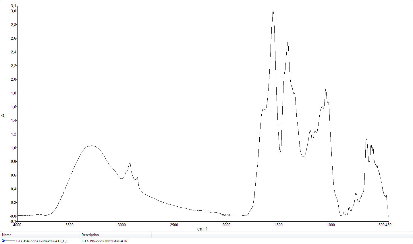 Mikrocheminiai ir instrumentiniai tyrimai: pH - 5,9; Geležies chlorido testas - teigiamas; Vanilino testas - neigiamas; Nitritinės rūgšties testas - neigiamas; Rodanino testas - teigiamas; Taninų klasė - Hidrolizuojami taninai; ATR-FTIR spektroskopija - Galo taninai.
