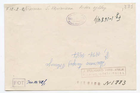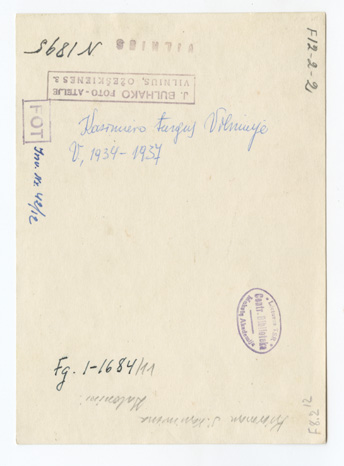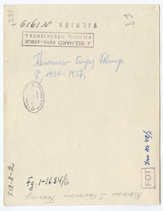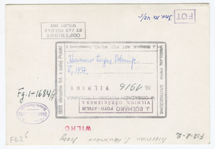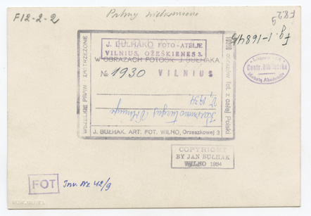 Apatiniame, dešiniajame fotografijos kampe įspaudas: J. Bułhak. Wilno. Kitoje fotogr. pusėje spaudai: J. Bulhako Foto Atelje//Vilnius, Ožeškienės 3. ; Copyrigt by Jan Bułhak. Wilno 1937