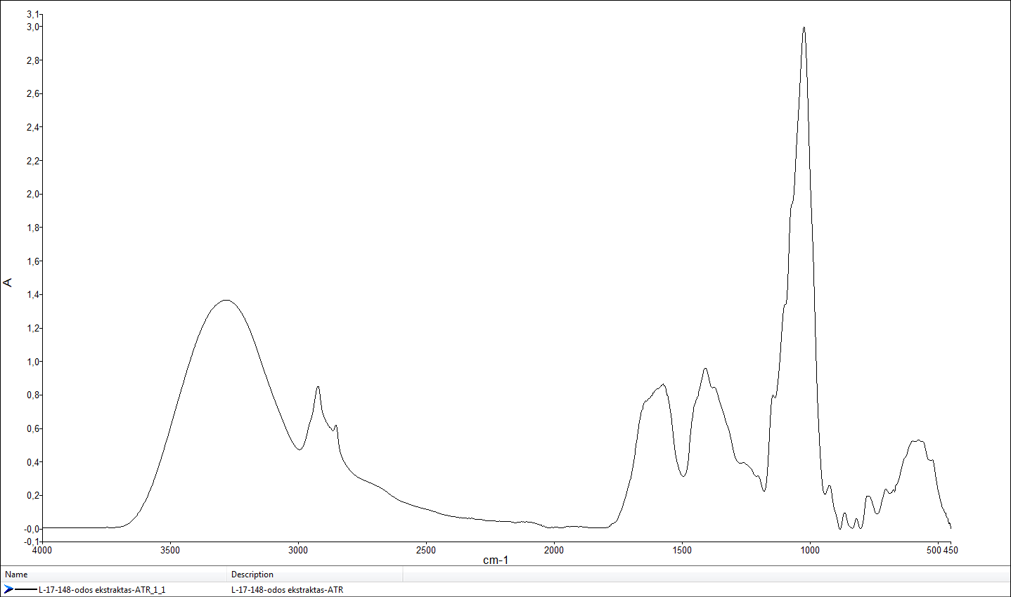 | dc.description | Mikrocheminiai ir instrumentiniai tyrimai: pH - 5,8; Geležies chlorido testas - teigiamas; Vanilino testas - neigiamas; Nitritinės rūgšties testas - neigiamas; Rodanino testas - teigiamas; Taninų klasė - Hidrolizuojami taninai; ATR-FTIR spektroskopija - Galo taninai. | |