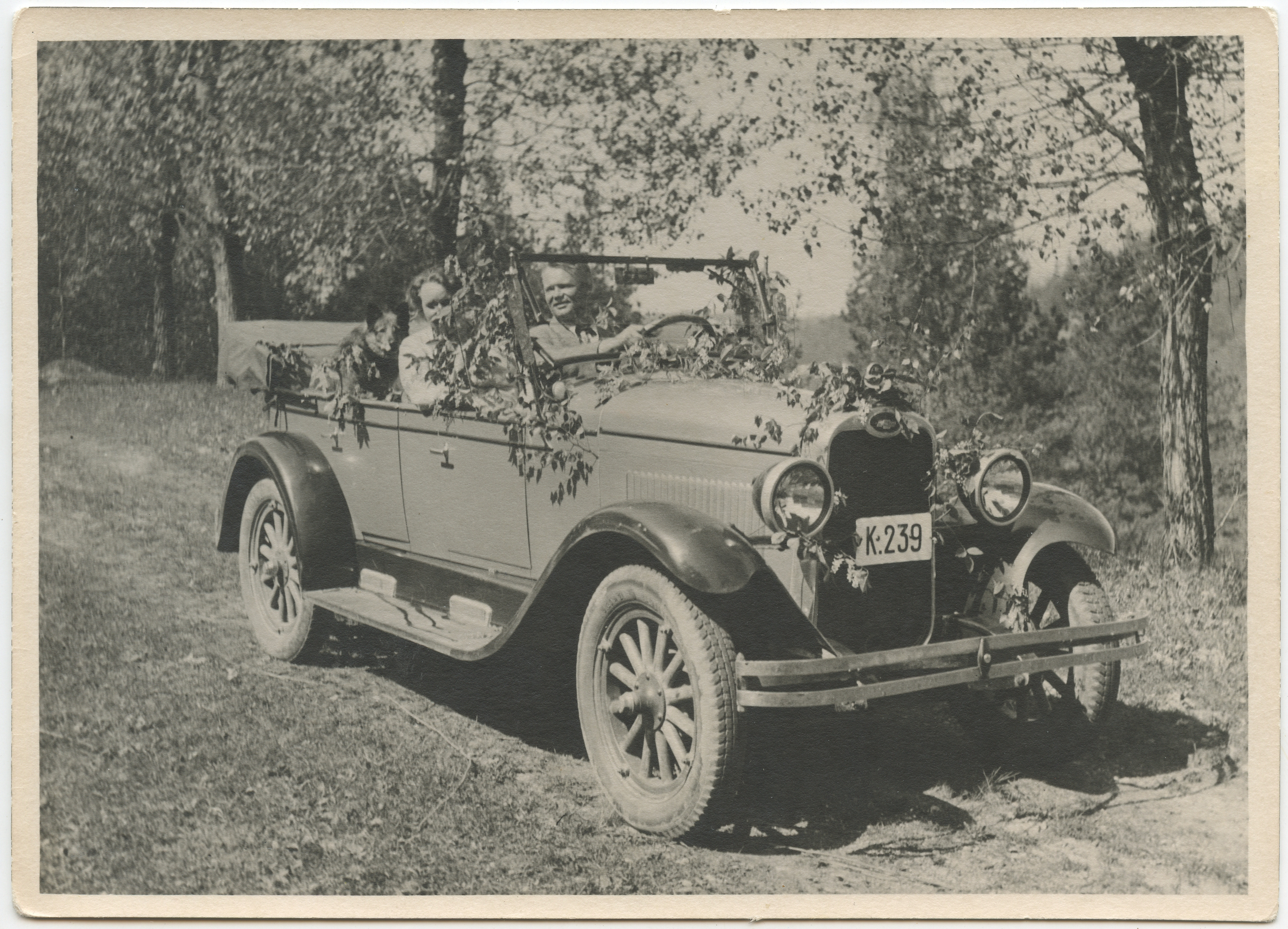 Kompozitorius Juozas Gruodis su žmona Stase ir šuniu Disu automobilyje : [iškyla Panemunėje] / foto S.Kolupaila, [Kaunas] : [S.Kolupaila], [1938], 1 fotografija : nespalvota ; 12.9 x 18 cm.
