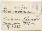 Lietuvos kariuomenės savanoris Antanas Skruzdis : [portretas], [Lietuva], [1919], 1 fotografija ; 6 x 4.4 cm.