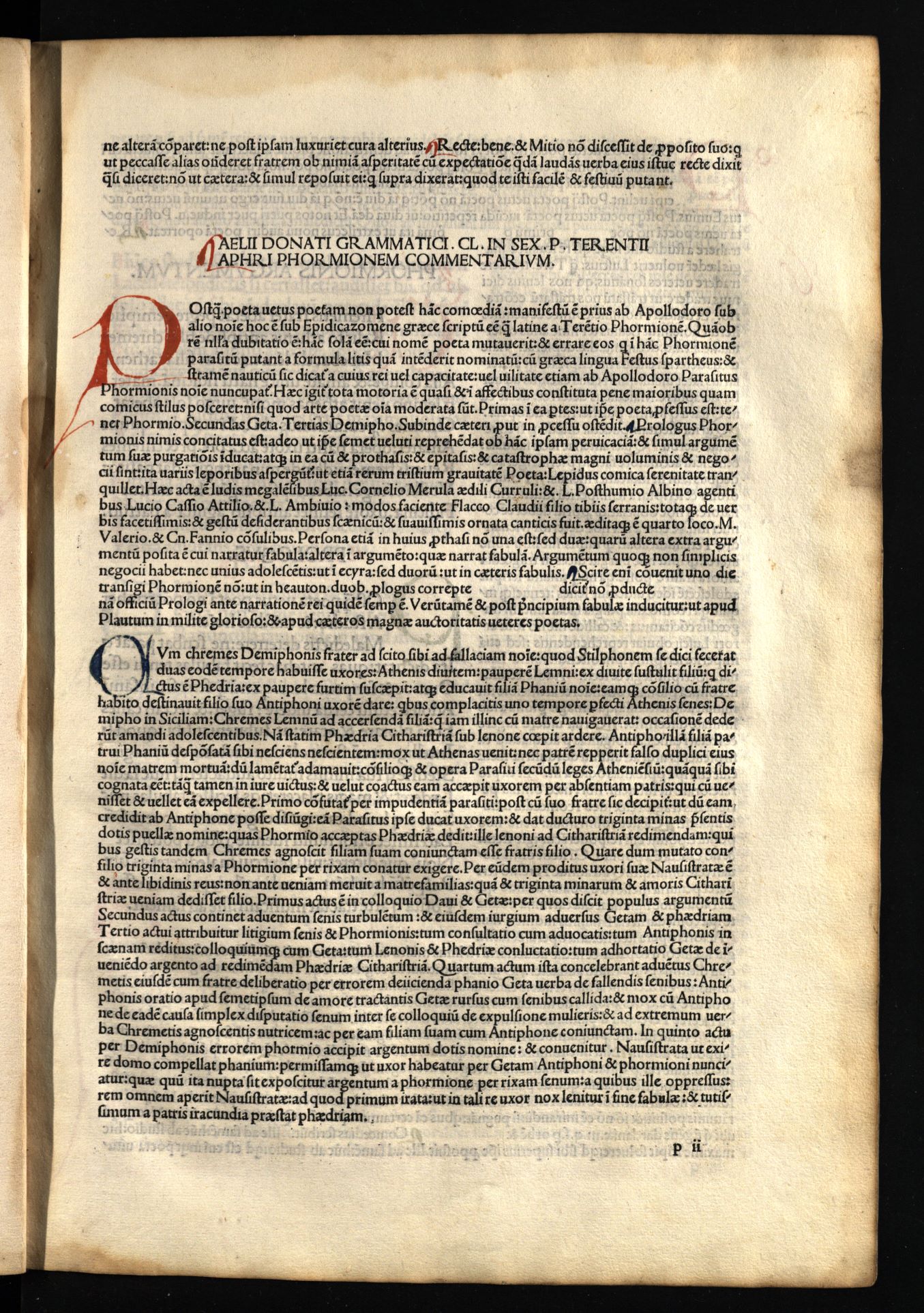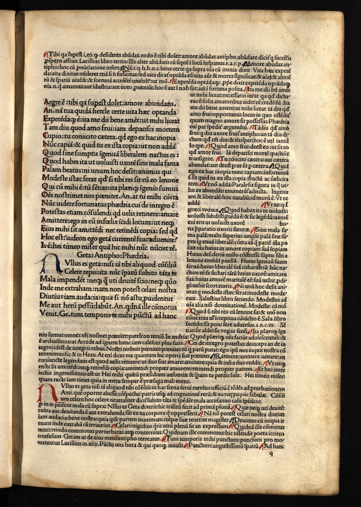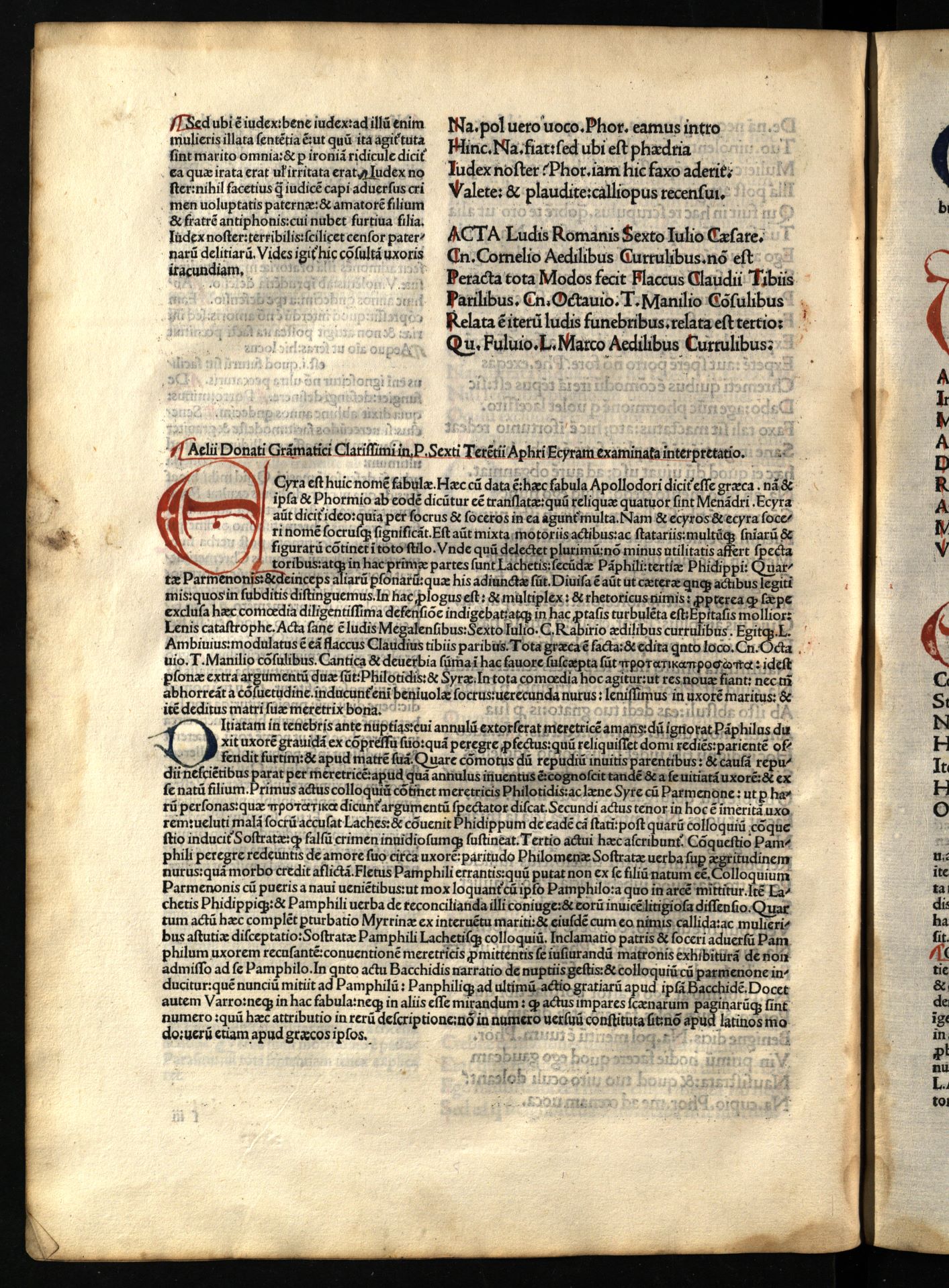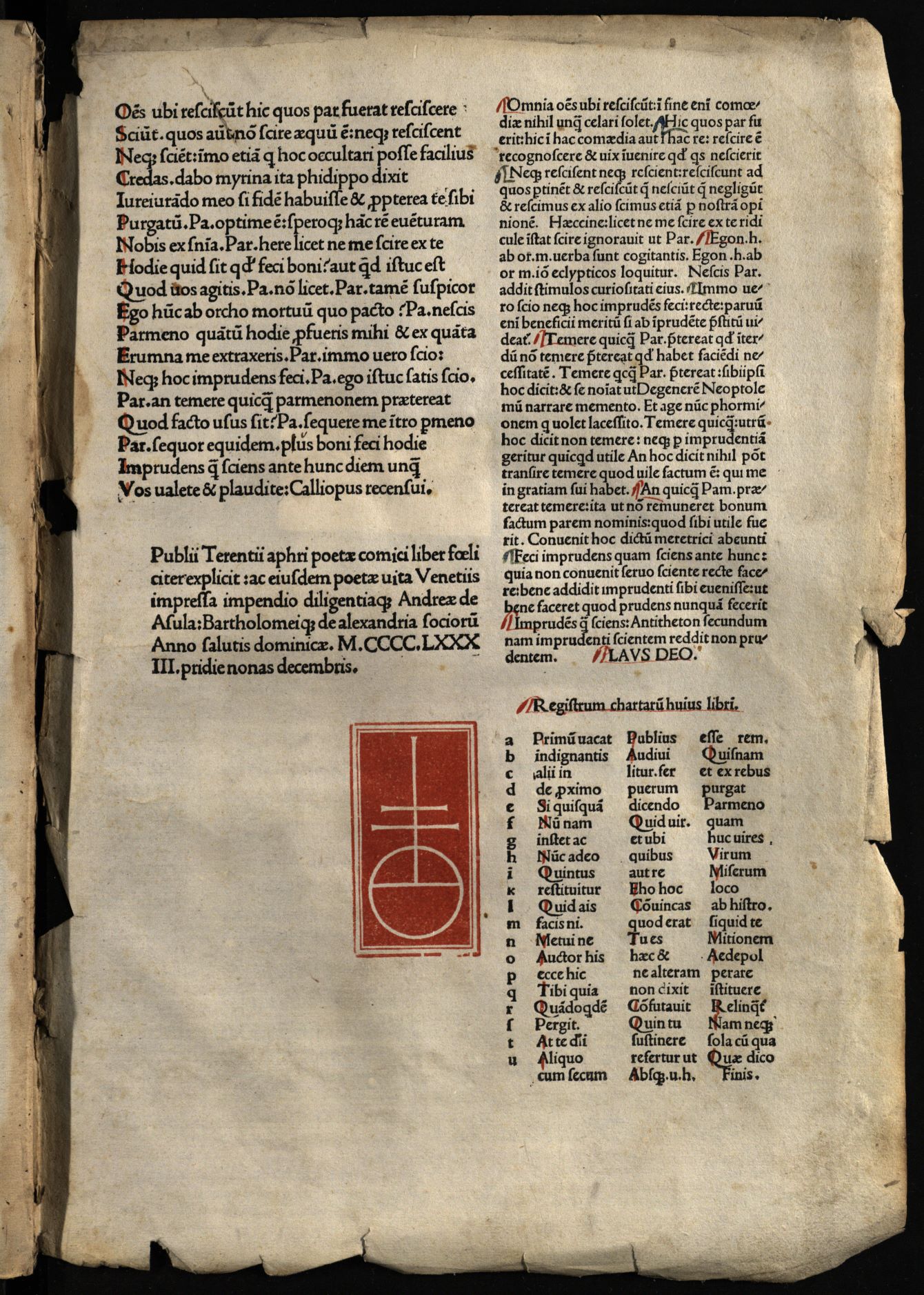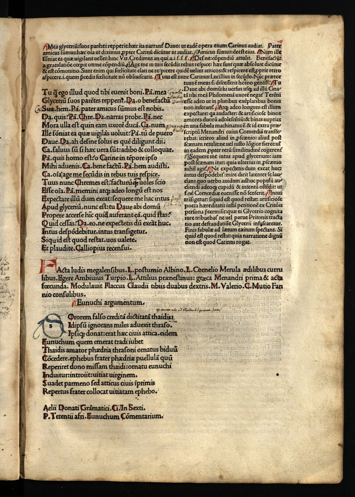 Comoediae / cum commentariis Aelii Donati, Venetiis [i.e. Venezia] : impressa impendio Andreae de Asula Bartholomeiq[ue] de Alexandria, M.CCCC.LXXXIII. pridie Nonas, 1483 12 04, 126 nenumeruoti lapai : inicialai, signetas ; 2° (31 cm).